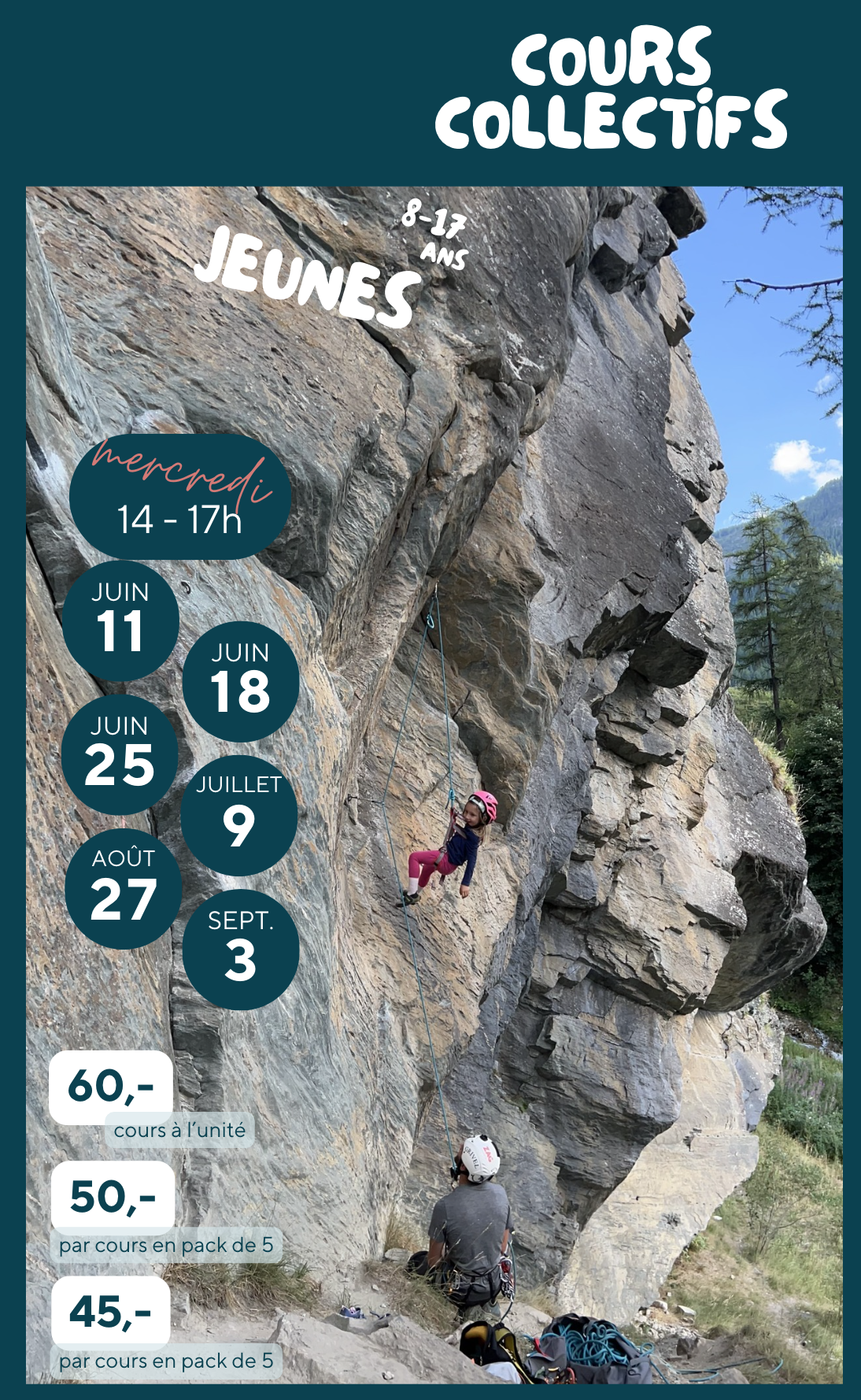 Envie de grimper dehors, de faire le plein d’énergie et de relever des défis verticales avec d’autres jeunes ? L’escalade est faite pour toi ! Dans ces cours, on apprend à grimper en toute sécurité, on découvre comment bouger sur le rocher, on gagne en confiance et on apprend à respecter la nature.