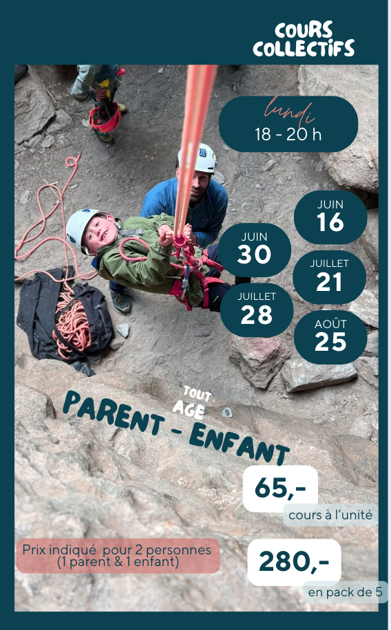 Cours parent – enfant – Une aventure à partager!Découvrez l’escalade autrement, en duo avec votre enfant ! Ce cours en falaise permet aux parents et aux enfants d’apprendre ensemble, de renforcer la confiance mutuelle et de vivre un vrai moment de complicité. Adapté aux débutants comme aux grimpeurs expérimentés, c’est aussi une belle opportunité pour les adultes d’acquérir les bons réflexes pour grimper en toute sécurité avec leur enfant. Si vous débutez complètement l’escalade, il est recommandé de commencer avec un pack de 5 cours pour acquérir de bonnes bases. Si vous avez simplement besoin de retrouver confiance, quelques séances peuvent suffire.